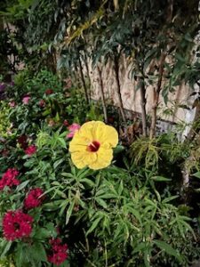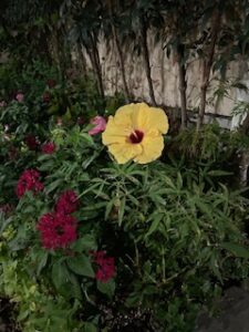 今まであまり気にしていなかったですが、花壇のハイビスカス風の花が、夜でも元気に咲いていました。昼間しか咲いているところを見たことが無かったので、少し驚きました。