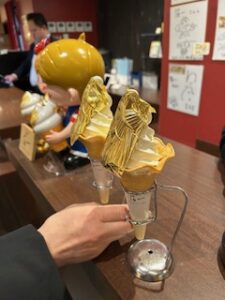 最近の最強寒波で金沢も大雪になっているとニュースでやっていました。金沢といえば金箔が有名みたいで、いろいろなものに金を入れて販売されています。ガラス、化粧品、コーヒーect、目を引いたのは金箔ソフトクリームでした。少し行列になっていましたが、値段も1000円以下でしたので食べてみました。味は全くしませんが、ソフトクリーム自体がおいしかったです。
